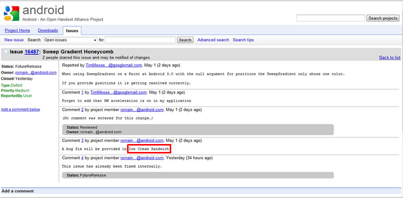 Android next Operating System name is going to be Ice Cream Sandwich, its something we’ve heard since the beginning of the year. But no official confirmation has been made on the matter. Well this isn’t a confirmation either, but an excerpt from a Google Android tech support leaks the information that a SweepGradient issue will be resolved in Android next OS version Ice Cream Sandwich.